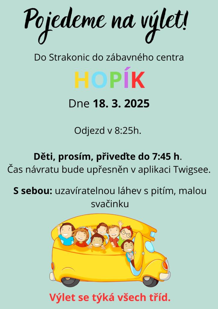 Na 18. března 2025 je naplánován výlet do zábavního centra HOPIK ve Strakonicích. Odjezd proběhne v 8:25, přičemž děti je potřeba přivést do 7:45. Čas návratu bude upřesněn v aplikaci Twigsee. Nezapomeňte si vzít láhev s pitím a svačinku.
